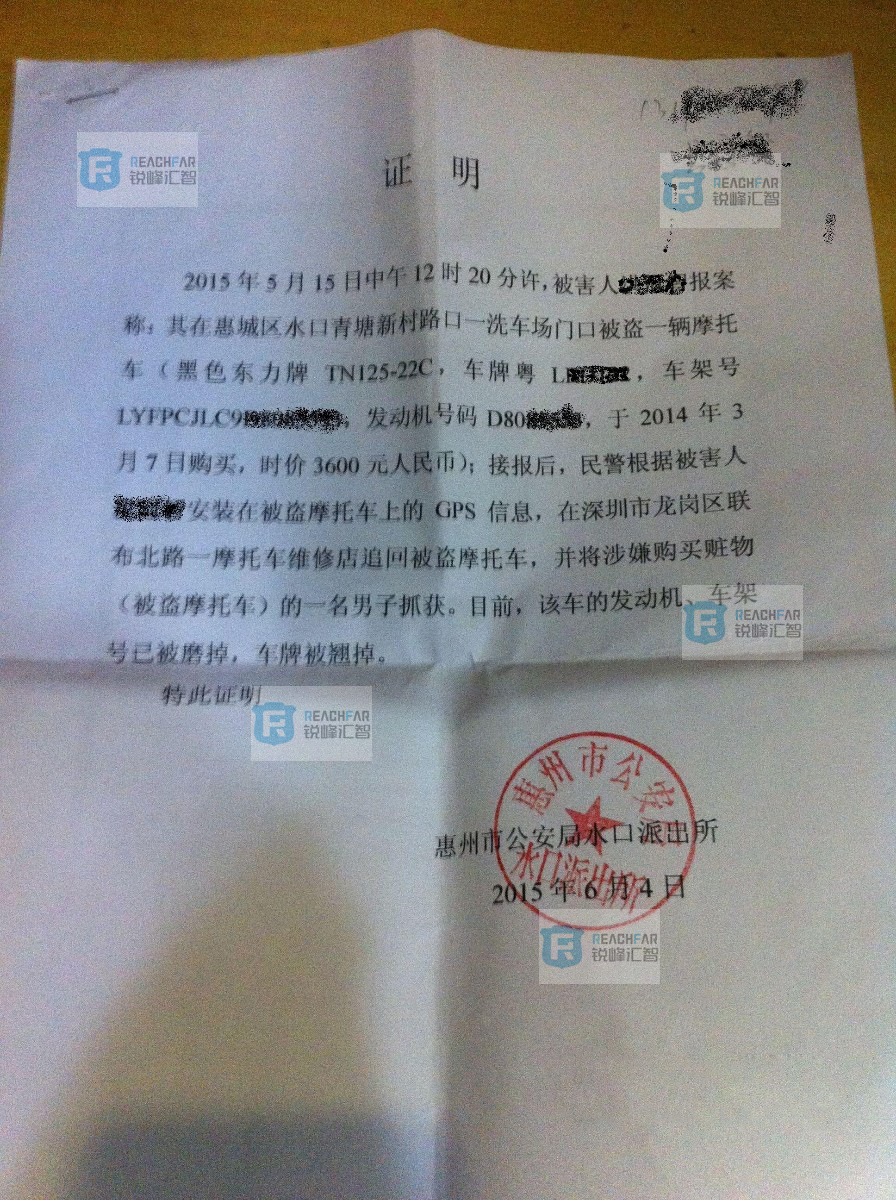 当天下午,民警就把找回来的被盗车辆返还失主。被盗车当天就失而复得,民警当然功不可没,不过试想如果失主的摩托车并没有安装GPS定位器,想要在茫茫人海中找到摩托车的声影可谓是大海捞针,由此可见GPS定位器的重要性。