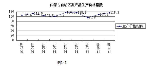 图1-1为2003年至2011年内蒙古自治区畜产品生产价格指数,数据来源:国家统计局。