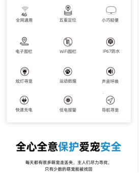 1.功能优势:4G全网通+多重定位方式,装卸便捷,IP67防水性强,狗子游泳也不会有任何影响,35g极简小巧,不会带来任何负重感,高压电池可以长久待机,定位精准度≤10米,运动计步,先进的智能感应炫灯,天黑自动亮灯,在黑夜里更方便的追踪宠物。App还支持一键导航寻宠,清晰展现定位方式卫星定位 ,非卫星定位一目了然,轻松辨明室内户快速找到宠物,智能炫灯和响铃,即使在黑暗的晚上都可以快速找到爱宠,还有电子围栏WIFI围栏,以WIFI热点设置围栏,可以准确知道被宠物是否离家,是否回家。