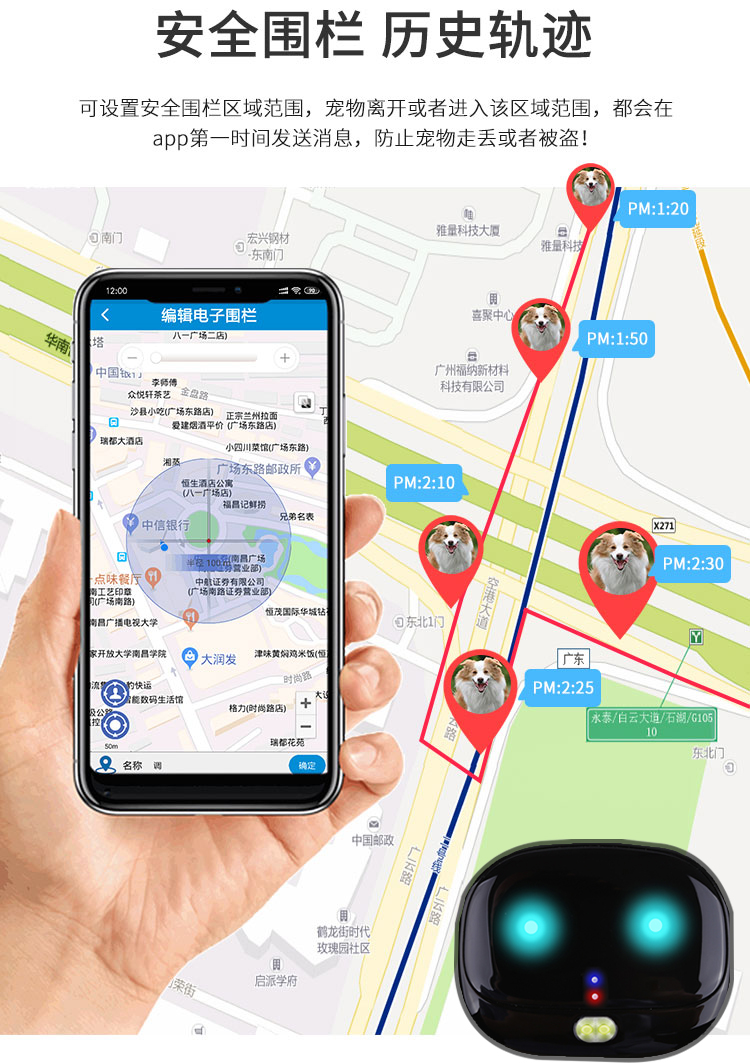 电子围栏告警:在手机app地图上设置好宠物活动安全区域,离开安全区域,手机APP端会收到报警信息。